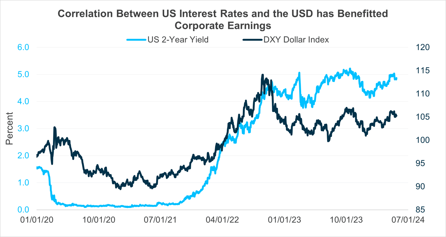 Perhaps at the heart of this shifting environment has been a positive correlation between US interest rates and the US dollar (USD), which has provided a dual win for many companies. The Federal Reserve has been working tirelessly to combat inflation, which has proven “stickier” than many had expected. The shift from extreme accommodation during the pandemic years to a much tighter policy has naturally ushered in a period of higher (if more normal) interest rates. In turn, this has allowed companies to generate material income streams for the first time in well over a decade. Meanwhile, a strong USD has benefitted companies that price goods and services in USD but have operating expenses in foreign currencies.